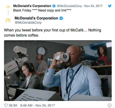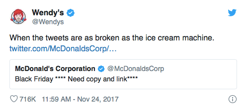 This is where McDonald’s has to use their own voice and personality to defend themselves. They don’t have the same personality as Wendy’s and can’t reply with a similar snarky comment. For example, McDonald’s accidentally tweeted their Black Friday tweet too early and Wendy’s immediately responded: