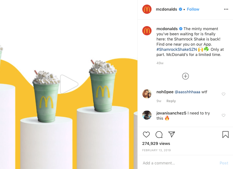 McDonald’s uses the same voice they use on Twitter, but added visuals to their voice. This content includes restaurant stories, food, and announcements. McDonald’s voice is very straightforward and lighthearted. For example, their Shamrock Shake announcement is an entertaining video to create excitement with a simple caption.